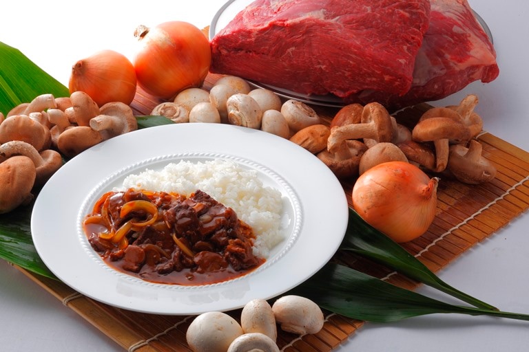 【ハッシュドビーフ】牛肉、たまねぎ、チキンブイヨン{鶏がら、野菜(たまねぎ・にんじん)、チキンエキス、食塩、香辛料}、トマトケチャップ、しいたけ、マッシュルーム、小麦粉、ウスターソース、乳又は乳製品を主要原料とする食品、植物油脂、デミグラス風ソース、ワイン、マーガリン、ポークエキス、マッシュルームブイヨン、ブランデー、トマトペースト、ローストオニオンペースト、食塩、粉末卵白/カラメル色素、調味料(アミノ酸等)、炭酸Na、クエン酸、